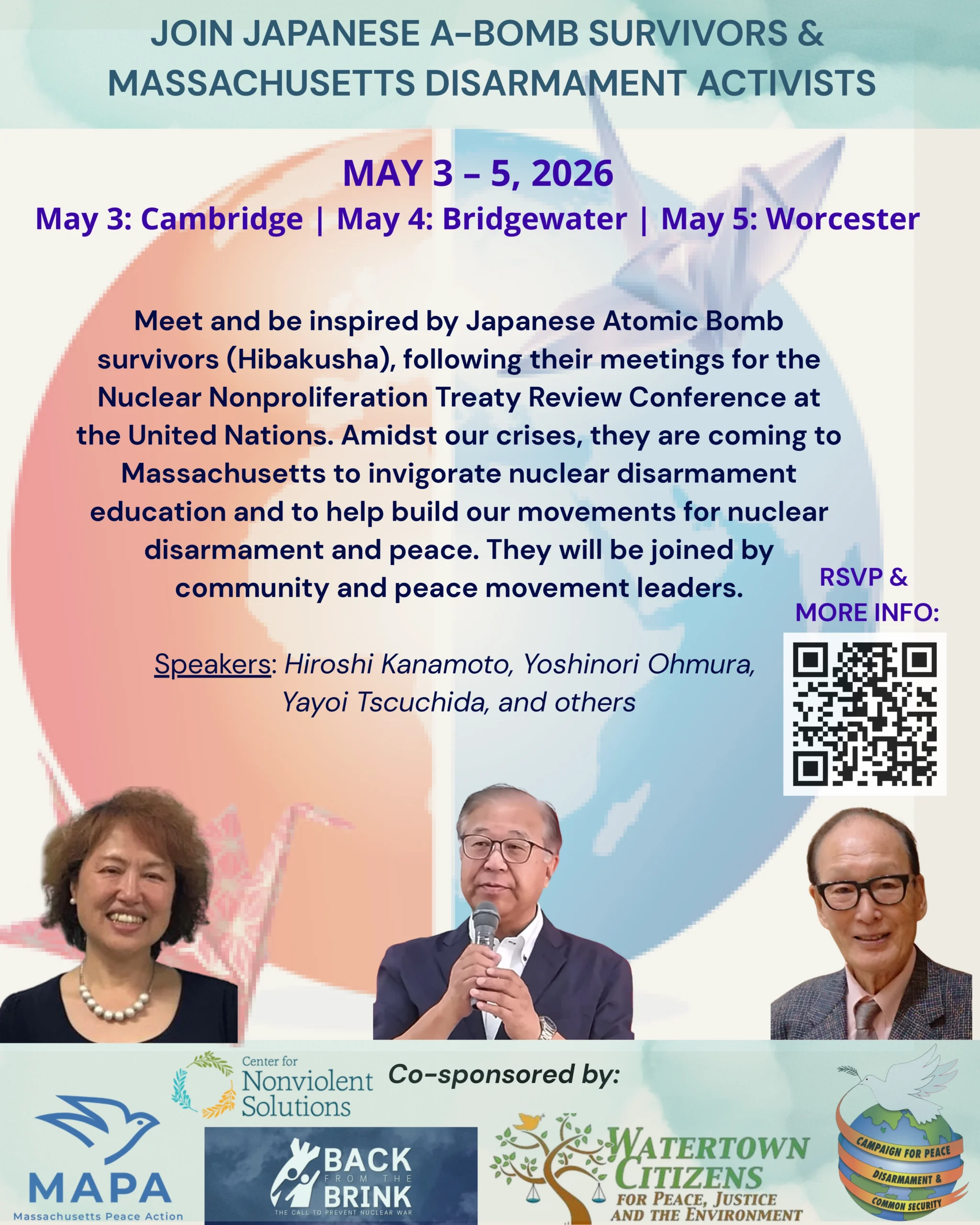 Japanese atomic bomb survivors (Hibakusha) will visit Massachusetts following the UN Nuclear Nonproliferation Treaty Review Conference to inspire and strengthen efforts toward nuclear disarmament and peace. Joined by community leaders, they aim to energize education and activism in response to today’s global crises.